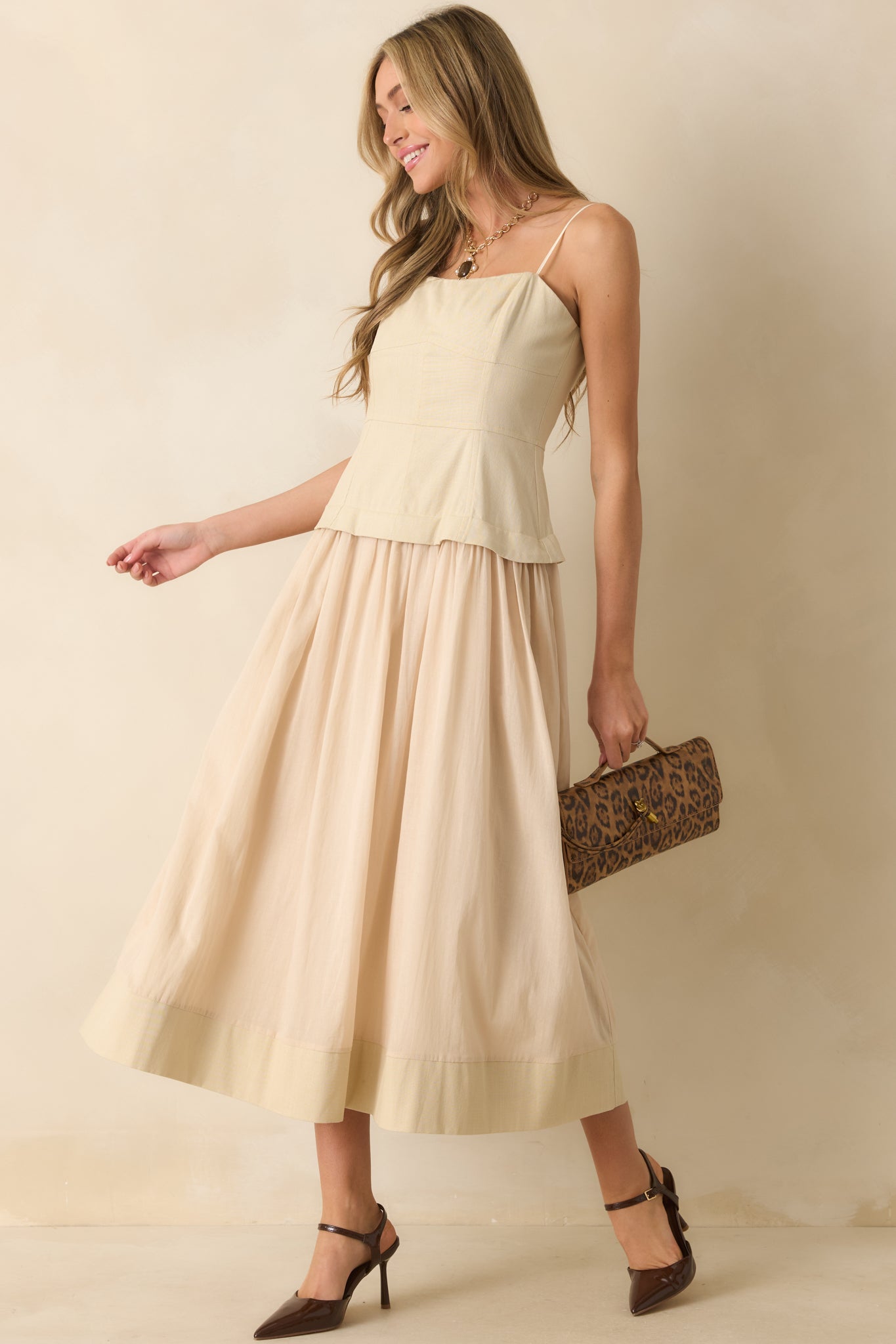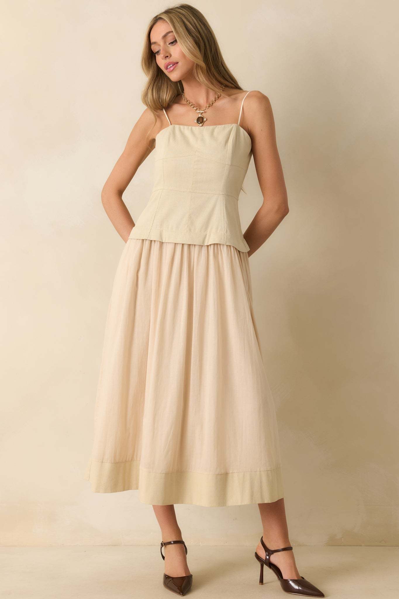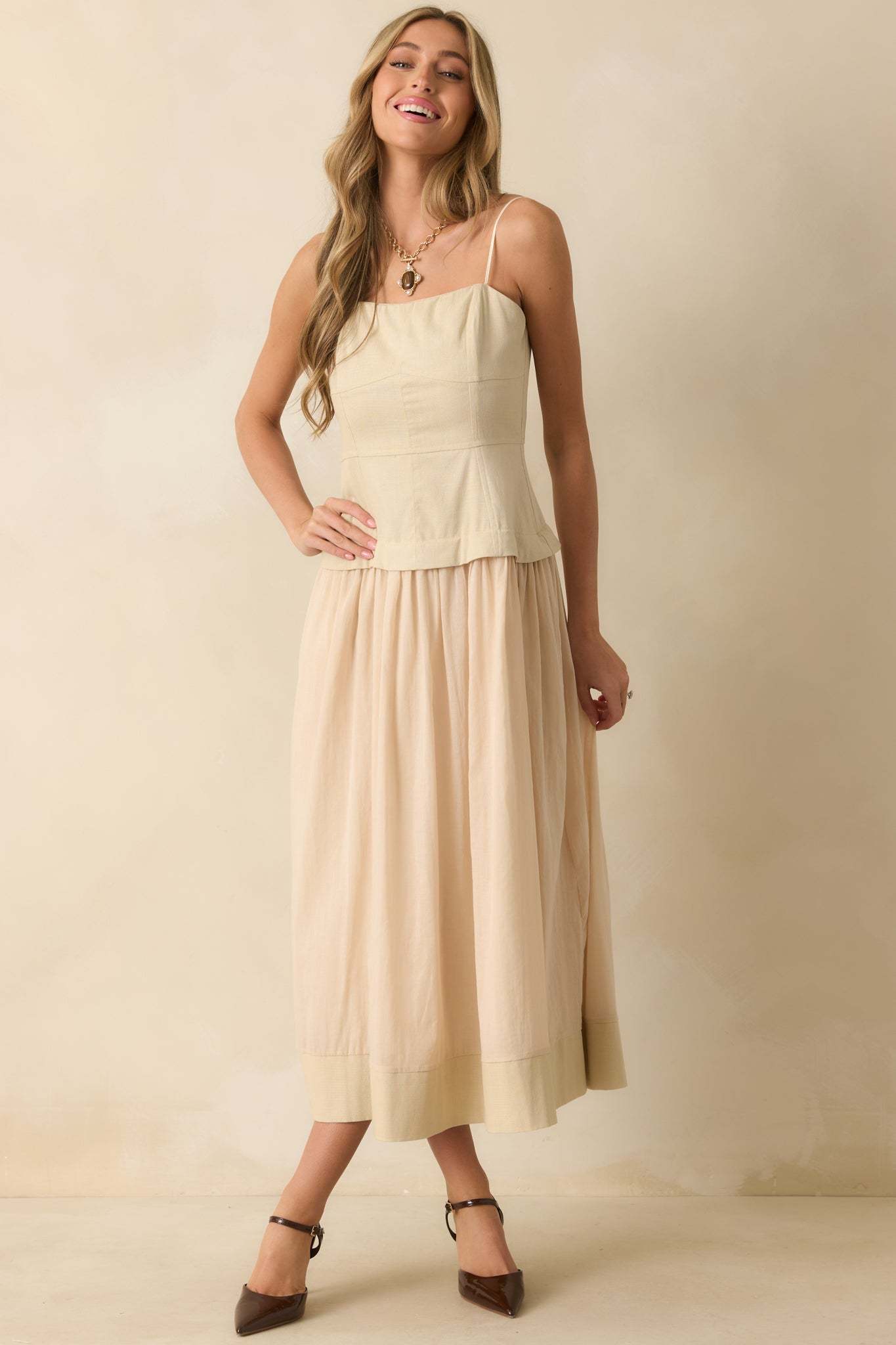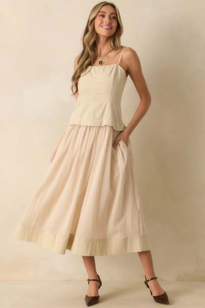 The You Already Know Beige Cotton Bustier Bodice Sleeveless Midi Dress goes wherever your plans take you, an endlessly versatile piece that works from day to night with ease. This beige midi dress features a bustier-style paneled bodice, adjustable spaghetti straps, a concealed back zipper closure, and a gathered flowy skirt, full lining, and functional pockets.